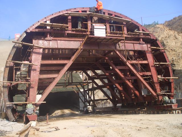 襯砌臺車是隧道施工過程中二次襯砌不可或缺的非標(biāo)產(chǎn)品,主要有簡易襯砌臺車、全液壓自動(dòng)行走襯砌臺車和網(wǎng)架式襯砌臺車。全液壓襯砌臺車又可分為邊頂拱式、全圓針梁式、底模針梁式、全圓穿行式等。在水工隧道和橋梁施工中還普遍用到提升滑模、頂升滑模和翻模等。全圓式襯砌臺車常用于水工隧道施工中,不允許隧道有砼施工縱向接縫,在水工隧道跨度較大時(shí)一般使用全圓穿行式;邊頂拱式襯砌臺車應(yīng)用最為普遍,常用于公路、鐵路隧道及地下洞室的砼二次襯砌施工。本文著重介紹山嶺隧道施工中常用砼襯砌臺車的設(shè)計(jì)與使用。