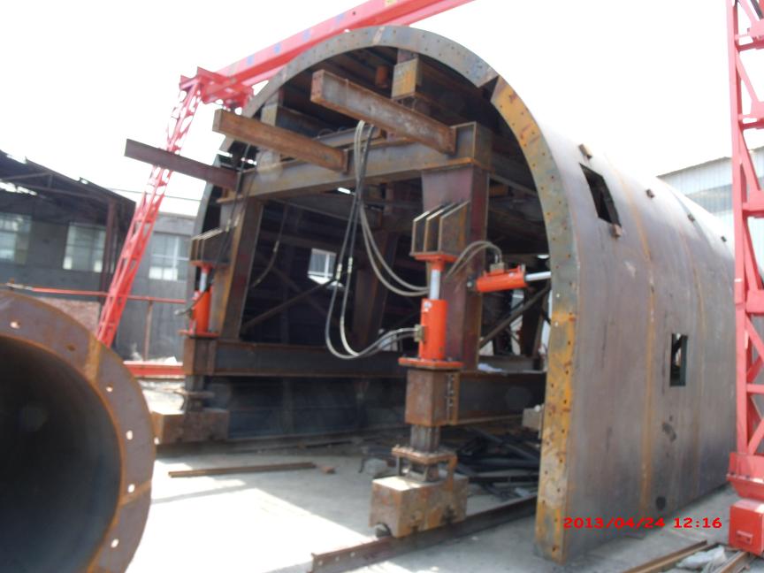 (2)操作液壓系統(tǒng)頂升油缸,使臺(tái)車升至標(biāo)準(zhǔn)襯砌高度,然后旋緊基礎(chǔ)千斤,之后復(fù)核高度尺寸;